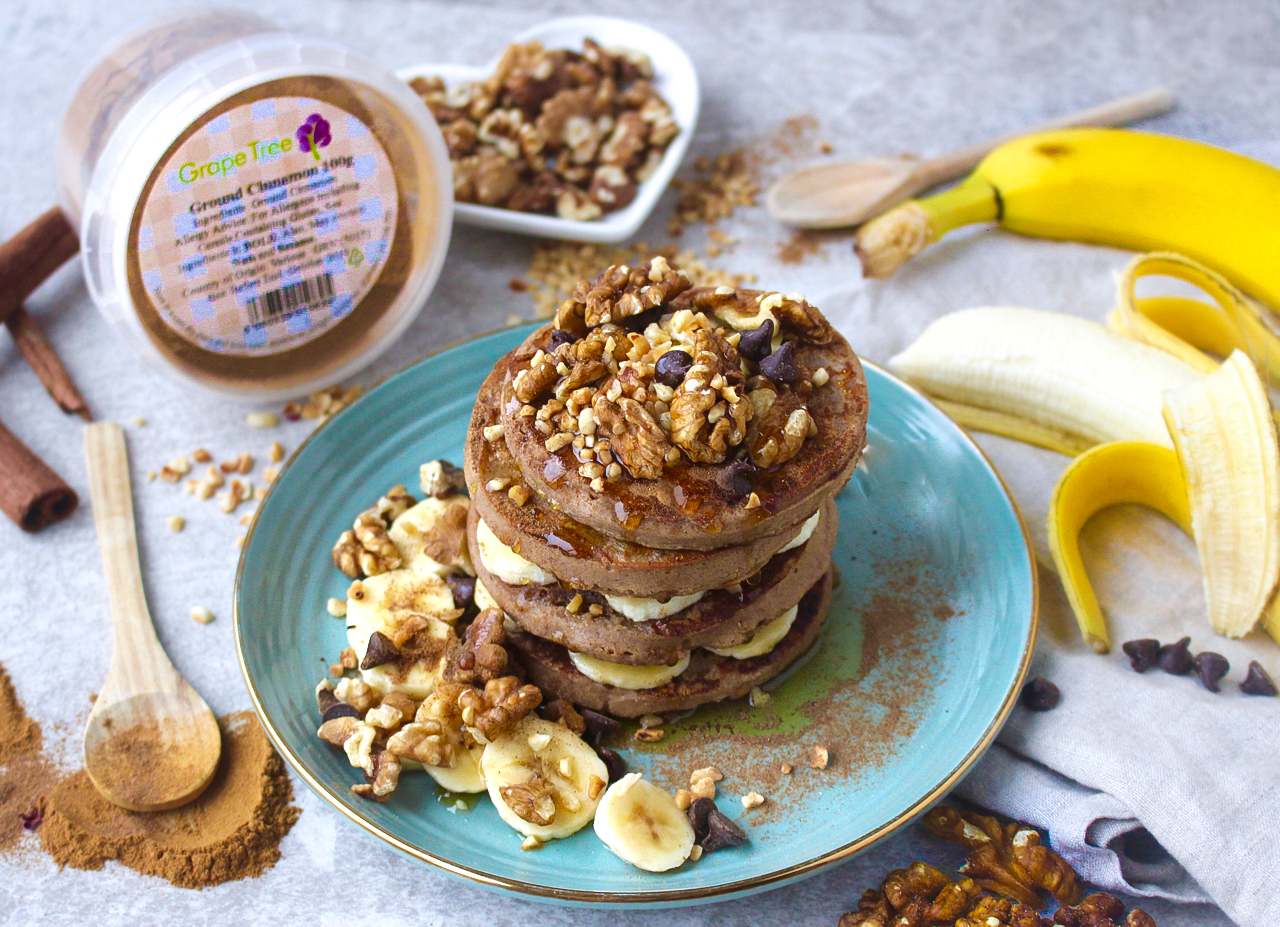 - Serve as a pancake stack decorated with your chosen toppings. We have used peanut butter and cacao nibs.